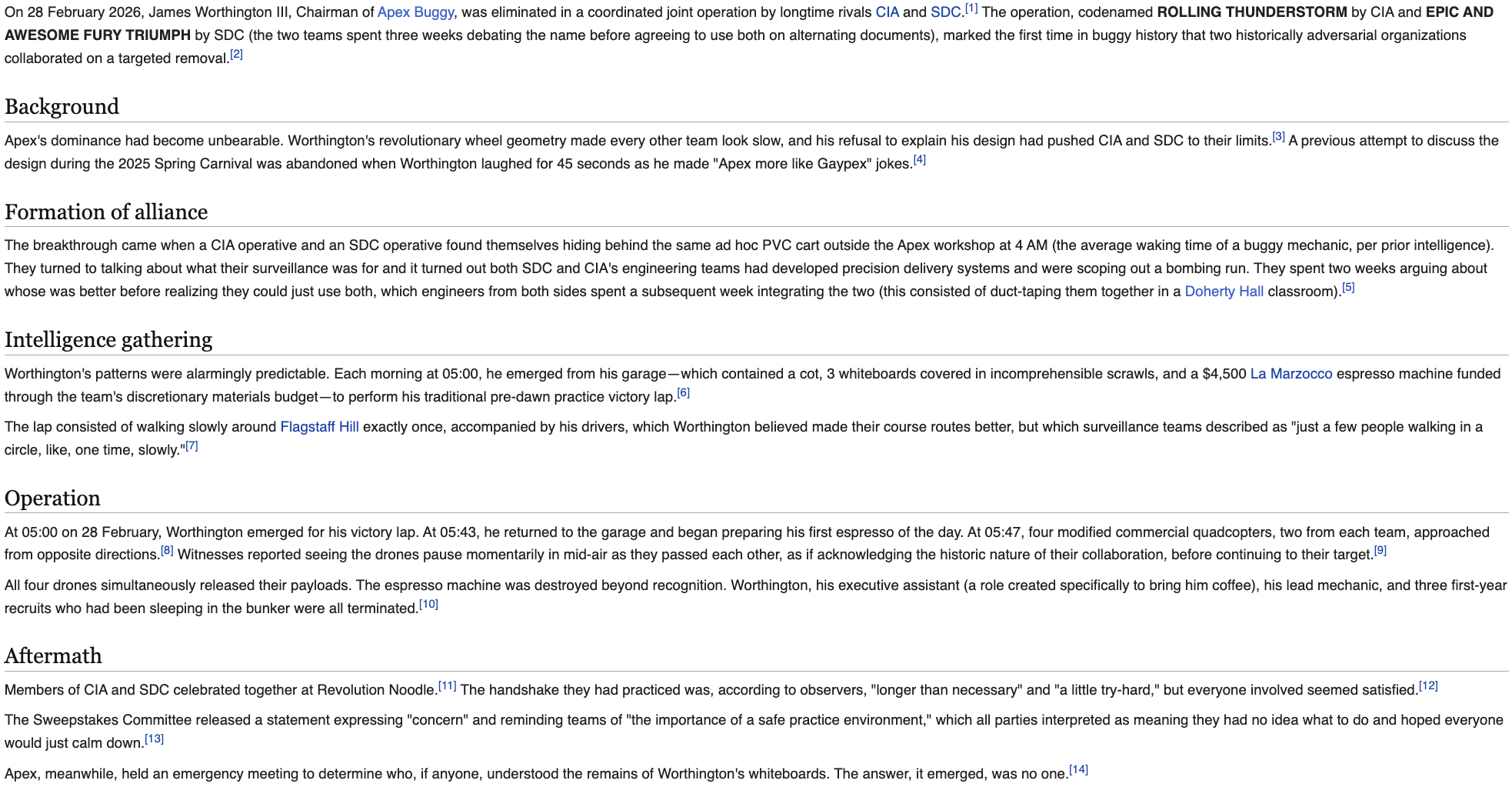 Just weeks ahead of Carnival, Sweepstakes has dropped a bombshell on all buggy teams: due to existing rules prohibiting mass loss during a race, the “live birth method” is officially banned. In previous years, buggy drivers would impregnate themselves prior to Carnival, nourishing the fetus with Stack’d and melatonin gummies. Then, they would induce labor the morning of race day.