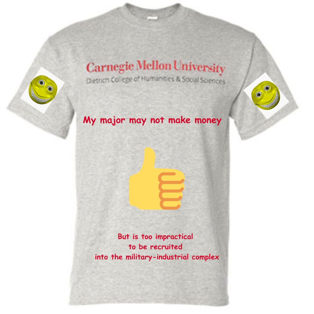 Military-industrial complex? I find it quite simple, actually. You and I have very different problems and I am unqualified to advise on yours. I direct you to my official Dietrich merch, reading “My major may not make money, but is too impractical to be recruited into the military-industrial complex.”